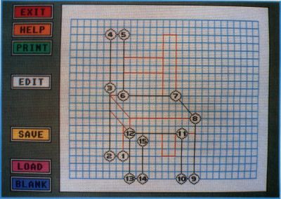 The main screen of DOTMAKER.PRG is very similar to that of the game itself. Instead of a blank white puzzle area, there is a blue design grid to help with the alignment of dots and lines. The EXIT, HELP and PRINT options function the same as in DOT2DOTS.PRG. In the game program, all the options are available at all times. In the editor, however, certain options will not function unless you have a puzzle in progress. For example, the PRINT option is not available when there are no puzzle dots to print; clicking on PRINT when the design grid is blank will result in no reaction from the computer.