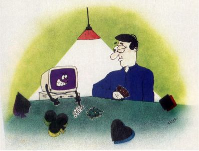 Upon receiving the hand, the player must determine which cards to hold and which to discard. This decision is made by entering the corresponding card number, one through five, of the cards to hold. In deference to the mouse, this method is faster, easier and closer to that used by the machines in Atlantic City. When the space bar is pressed, the cards not chosen to be held are flipped over and replaced. If the remaining hand yields a pair of jacks or better, the player wins. The amount of winnings is reflected by the strength of the hand and the number of coins played, as highlighted at the top of the screen.