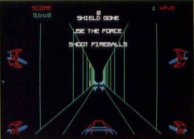 The game had different difficulty levels, but a typical "wave" went as follows. First you were flying in space above the Death Star, blasting TIE fighters and at the same time detonating the "fireball" shots they fired back at you. The TIE fighters swarmed like gnats and were difficult to hit on the higher levels. Darth Vader's custom TIE ship would cruise through, and while you couldn't destroy it, every time you hit his ship you got a hefty pile of points.