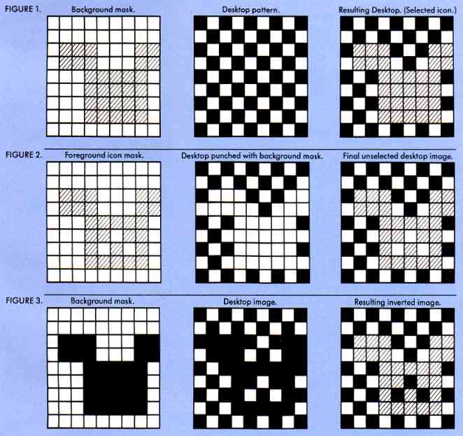 The background mask of an icon performs two tasks. Before an icon's foreground mask is placed on the desktop, the background mask is logically OR'd with the desktop surface. Thus, whatever shape is in the background mask will show up as a hole on the desktop. Think of the background mask in this sense as being a "cookie cutter," which will punch out a hole in the desktop, leaving only empty space.