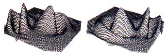 Figure 8 (A and B). Z =2*(2 ^ (-((X-.5) ^ 2+(Y-1) ^ 2))-2.5 ^ (-((X+2) ^ 2+ (Y+1) ^ 2)))*COS(R); grid scale = 0.10; 32 grid lines per positive axis. This function basically superimposes two hills (the exponential functions) on a cosine curve symmetric about the origin. Two views are shown.