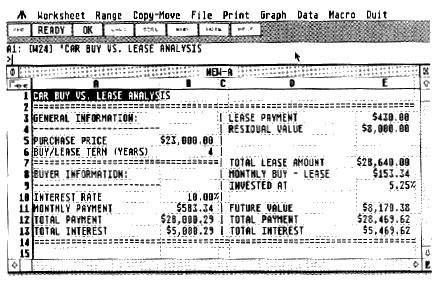 Once again, the brevity of the spreadsheet does not detract from its usefulness. Open your Sunday paper now and experiment with your own figures. If your lease payment is very reasonable, and if your purchasing interest rate is rather high, you may find leasing actually cheaper than buying outright at a financed rate! The only other comment I might make is about the formula in cells A4 and A9, which neatly underlines the text in the cell above. If you change this text, the length of the underlining will be adjusted dynamically. The formula does not underline labels with leading spaces well or cells with non-label content.