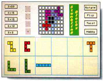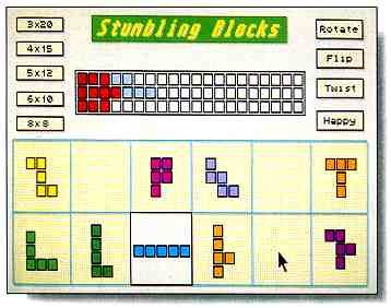Stumbling Blocks also lets you manipulate the shapes. To the right of the grid you'll see four boxes: Rotate, Flip, Twist and Happy. Move your cursor to the shape you wish to manipulate and click the right mouse button to highlight that shape. You can then change the shape to your needs.