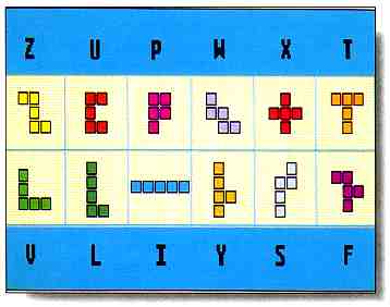 If you successfully complete a grid, Stumbling Blocks will let you make a printout of the screen. As I couldn't do a graphic dump of your solution, due to the many and varied printers on the market, I have used a coded text dump which is easy to understand. Each of the shapes can be identified by capital letters as seen in the accompanying diagram.