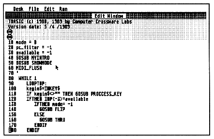 T-BASIC is an interpreted BASIC. You type in your program as a text file. When you go to run the program, T-BASIC executes it line by line. There are two operating modes: edit and command line. Most of what a MIDI user will probably want to do with T-BASIC will not involve a sophisticated graphical interface. This is fortunate, since the most useful GEM function for simple user interaction and messages is the dialog function, which crashed my programs every time I tried to use it. Until this problem is fixed, I'd ignore the GEM features of T-BASIC and stick to traditional BASIC statements like PRINT, INPUT and so forth. By doing so you'll get satisfactory, if less than artful, results. There is no compiler to create stand-alone versions of your programs.