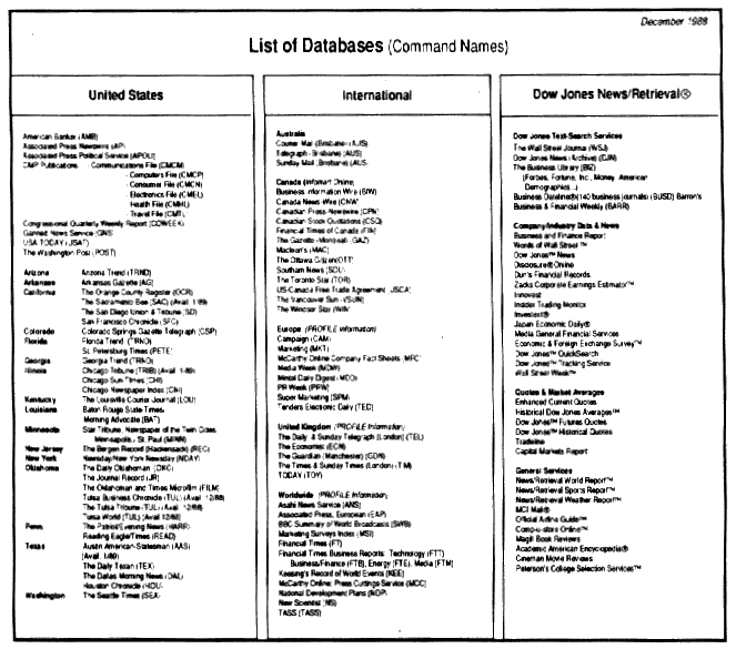 DataTimes has about 30 magazines online, including US. News and World Report, Business Week, Forbes and Fortune; industry-specific magazines, such as Computer Reseller News and Computer Systems News; and travel, health and industry magazines. For a quick overview of important DataTimes commands and a full list of databases, see Figures 1 and 2.