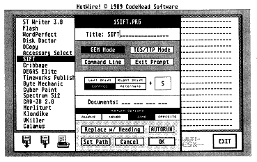 The Options box lets you decide which keypress will run a particular program. Just enter a program name in the title field, enter the type of program (i.e. GEM or TOS/TTP), click on Command Line or Exit Prompt if you want, then set up your key combination. Enter a letter from A to Z, then (optionally) select any combination of the [Shift] keys, [Control] and [Alternate]. Those 16 possible combinations, plus the 26 letters, give you 416 possible Hot Key combinations. The Return options at the bottom of the Options box determine whether you'll return to the Desktop or the HotWire menu after you quit a program.