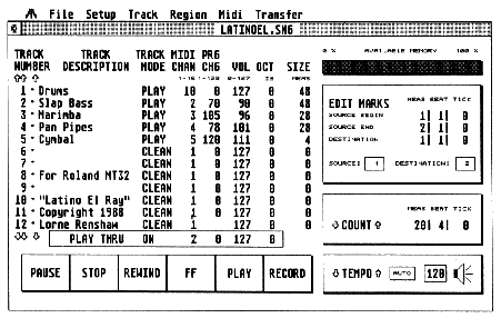 Recording and playback are controlled by screen buttons simulating tape recorder controls for Forward, Rewind, Record, Play, Pause and Stop. These are located on the right side of the screen along with controls for tempo, tape counter metronome on/off, internal/ external sync, song transposition and memory use indicator. MIDI system commands can be sent on any or all channels to set omni/poly/mono mode, local on/off, all notes off and issue a tune request.