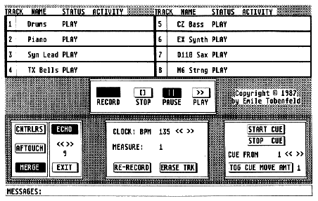 Two workscreens are used: one for record/playback and another for editing. The record/playback screen appears as an 8-track tape recorder with screen buttons for Record, Stop, Pause and Play controls. Locations within the song are specified by measure, relative to a userdefined meter. You can start from the beginning of a song or a specified cue range. Tracks play from beginning to end, then loop. Track one acts as a conductor track, setting the overall length for all tracks. While recording tracks are assigned sequentially-you cannot pick a particular track to record on.