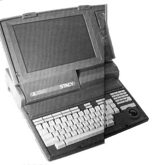 STACY has a backlit supertwist LCD screen, meaning that the display is visible with no external light and retains good contrast in almost any lighting situation. It mimics the ST monochrome screen and has a full 640-by-480 pixels in a 53/4-inch-by-9-inch display. Under the display in bold letters is the logo ATARI STACY. (According to Atari, this is the official name: STACY, all in capital letters.)