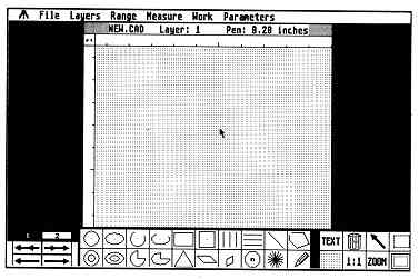 BeckerGAD's opening screen uses a very straightforward, icon-based system (Figure 1). The row of icons along the bottom control most of the major CAD elements. The program uses standard GEM menus along the top for file functions and other options that are required less often. Objects are placed into the drawing simply by selecting one of these icons and clicking on points on the screen.