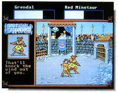 Unfortunately, as with many other games of this type, the "arcade" sequence of your arena battle leaves a lot to be desired. You have only four basic moves - block left and right, and hit left and right. Your character cannot move. Since my preferred method of combat is run and jab (float like a butterfly, sting like a bee...) I don't do well in the arena. Further, all the moves look pretty much the same, and the characters are not very responsive. The combat is interlaced with witty comments about the fight, which generally go by too fast to read.