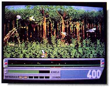 On the ST, StarRay fighters are equipped with lasers that destroy anything in sight. (It appears Amiga owners have the added option of less lethal vaporizers for use in those tight dogfights near friendly installations.) Your shield power is reduced every time you ram an enemy ship or get hit by their fire.