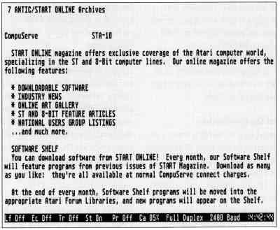 You also can run up a phone bill quite easily because the BBS may be in a different call-zone. The difference could be up to 50 cents a minute. Also, baud rate can affect expenses. If you have a 1200-baud modem and call a 50-cent-a-minute service, a DEGAS picture could cost you $1.50 to download. A 2400- baud modem could cut this time and money by half.