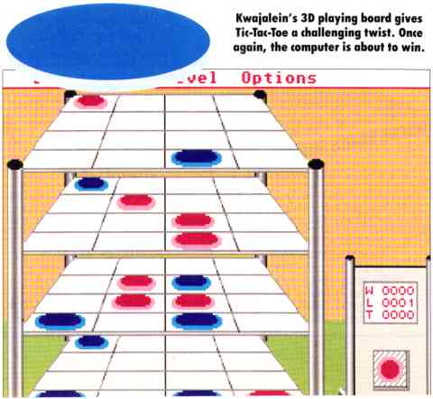 Not too long ago, I found myself taking a computer class - learning Pascal on a VAX mainframe. One of the assignments was to program a Tic-Tac-Toe game. That made me think of a 3D Tic-Tac-Toe I played on a computer while in high school, so I adapted that idea for my assignment. Later, I couldn't resist the temptation to port my VAX Pascal program to my favorite computer and favorite language: the Atari ST using Laser C. Kwajalein is the result of that effort. With the ST's slick graphics, sound and GEM interface, Kwajalein is a far cry from the old matrix of X's and 0's on a data terminal!