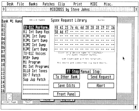 Available memory permitting, MIDIBOSS can hold two patch banks. 520ST owners are restricted to a single bank in memory, preferably using the program in standalone mode. It works well even with a single floppy-drive system and no hard drive. Just dedicate a floppy disk to sysex files, and pop in the disk before selecting any patches that have tagged syex data. An extended-format floppy will hold either three full M1 banks (300 programs, 300 combinations, 20 sequences and 3 banks of global data), 16 D110/D10/D20 banks, or 42 DX7 banks (1344 patches). In this case, a little definitely goes a long way.