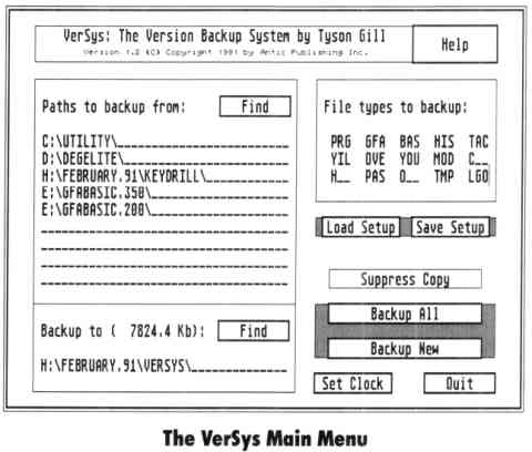 Set Clock: Backups are stored in a folder named with a time and date code, YYMMDDHH.mm?. YY indicates the year, such as 89. MM indicates the month, 01-12. DD indicates the day from 1-31. HH represents the hour, 01-24. mm represents the minutes, 00-59. The last character, ?, is replaced with A if all files have been copied or C if only changed files are in the folder. Obviously, the date and time on your ST clock must be accurate in order to name the backup folders correctly. The Set Clock option allows the clock to he checked and set. For example, say that it is June 17, 1991 at 10:20 and you wish to hack up all programs from the folders D:\PROJECT1\ and D:\BOB\WHITE\ to E:\. VerSys would copy all files of the specified types to the new folders E:\9106710.20A\PROJECT1\ and E:\91061710.20A\BOB\WHITE\.