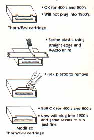 I recently purchased Thorn/EMI's Jumbo Jet Pilot game because the salesman assured me that it would work on my Atari 1200XL. I soon discovered, however, that the cartridge would not even plug into my computer! After investigating, I determined that the cartridge's case was preventing it from loading properly. The following illustrations show how I modified my Thorn/EMI cartridge. It plugs in now, and seems to play well (though I haven't mastered the game yet).