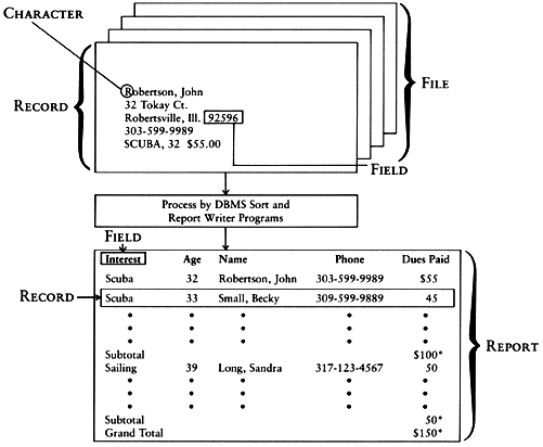 ![]() A DATA FILE may be organized in one way and reported in different orders. In this example, a name and address file with addressees' interests, age and dues paid, is organized by DBMS sort and report writer programs into a report by interest area with total dues by area. The report omits data not needed for this use. The data file could be sorted in different orders and reported in different formats. |