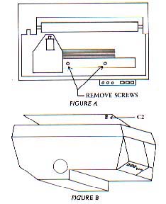 6. Pull out the end of the printed circuit board nearest you (and farthest from the stepping motor) enough to identify capacitor "C2" (about 1 inch). (see Figure B) This capacitor is marke on the board so you should find it easily. Holding printer bottom-up and the stepping motor away from you, C2 will be at the extreme right of the printed circuit board, directly behind similar capacitor. Heat up the leads with your solder-gun, remove the defective capacitor, install the newly-purchased capacitor and re-solder the connections. Assemble in reverse order, plug in, and enjoy the peace and quiet of your NEW NEC!