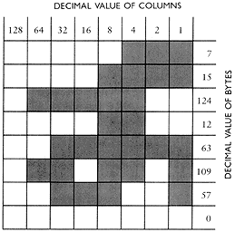 The boxes are binary (they are either on or off), but PILOT needs them in decimal notation. The conversion is easy. The numbers across the top of the chart show the decimal value of each column. For the decimal value of each row, add the column values of the filled-in boxes. In the top row, the 4, 2, and 1 column are filled in, so the value of the first byte is 7. Add across each row until you have the value of all rows, These will be the values of the eight bytes making up your custom character.