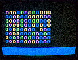 and RUN the program once more. You still see multicolored O's all over the screen, but this time they are lower case, and are surrounded by yellow hearts. The same four numbers still appear in the window. Look at the table on page 55 of the Guide again. In Column 4, you find lower case o listed as number 111. If you perform the arithmetic for Conversion 4 in Table 9.7, you get the same four numbers-79, 111, 207, and 239.