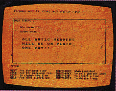 Let's take a look at the selection of ganes available on PLATO. After all, PLATO was a great source of games -- many of them involving more than one player - long before the Atari even existed. You can compete against, or work with, other users from around the U.S. or around the world. What a great way to play! The only thing I know of that compares to it for the Atari is COMMBAT, a two-person game from Adventure International, and even COMM-BAT doesn't really compare to the classic PLATO games.