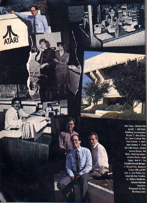 Next door to Neil's office is the oversized closet that houses the Atari Base bulletin board with its five sets of 520STs, hard disks and modems. Across the way is the desk of Atari Users Group Coordinator Sandi Austin. "Most of the people in this part of the building are in Marketing or they work for Diana Goralczyk in Customer Relations," says Harris. Customer Relations phones are (408) 745-2367 or (408) 745-5753.
