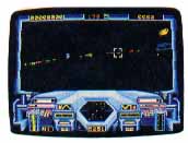 Your view is out the cockpit, and the graphics and animation are simply amazing. You appear to be moving over the surface of a darkened planet, with structures and enemies depicted in vector graphics. The documentation, consisting of a novella, flight manual and quick reference sheet, gives quite plausible reasons why the planet is dark and why you can see through buildings and vehicles. Moving your mouse left and right alters your flight direction, allowing you to line up your sights on targets and blast away with your lasers. Enemies explode convincingly, scattering pieces. Digitized sound and voice complete the realistic simulation of combat.