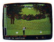 Of course the computer keeps score, and tells whose shot it is (which can get confusing when you're pretending to be a foursome all by yourself). You see the scorecard after each hole, and you can post outstanding scores to the Hall of Fame. If your game is interrupted, save it to disk and return to it later.