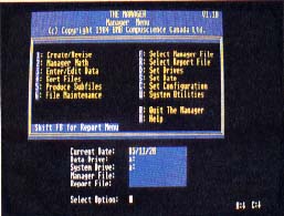 I didn't have many problems with The Manager, but I confused the program, and myself, when switching between different databases with the same name on different disks. The Manager worked fine on a single-drive system, although I had to swap disks twice as often. The routines to back up and recover files from the hard disks are not implemented in this version. I also couldn't use one of the Print Screen Revise/Edit options.