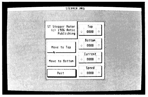 Antic Disk owners can LinkLine the program over to their STs right away. LOAD both STEPPER.PRG and STEPPER.RSC to your ST. For the program to fully work, you need to build the interface board described in the 8-bit stepper motor story. However, if you just want to study the programming of ST dialog boxes, this program will run only if you have your printer connected and online.