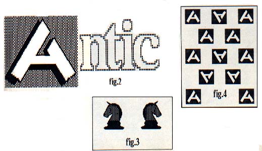 Figure 4 is a similar example of multiple print passes, this time with small graphics. Here, the Antic A was combined with an inverted A. Load Print Shop, select sign, go to the graphics entry screen and select a (from the Layout Guide) to avoid overprinting on the second pass.