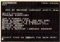 The Machine Language Access menu lets you manage your binary files, such as data files, or machine language utilities and games. From this menu you may [R]un or [L]oad a binary file and [S]ave or [A]ppend memory to a file.