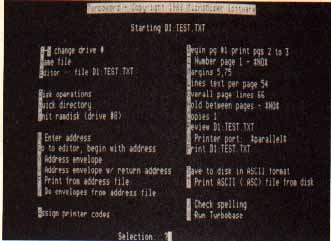 TurboWord is very modular and runs best with a RAMdisk. Like many top-of-the-line programs, it performs best with SpartaDOS (not included), ICD's SpartaDOS lets you use extra memory, directories, and even hard disks. With it you can build your own custom environment. TurboWord also runs under DOS XL and MYDOS, as well as DOS 2.5. I tested it with SuperDOS, but the XEP driver did not work (perhaps a memory conflict).