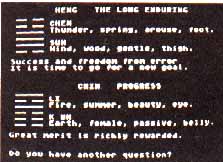 Using the Atari's random number generator, the coins are tossed to determine a hexagram. Like binary code, six lines of either yin or yang provide 64 distinct hexagrams.