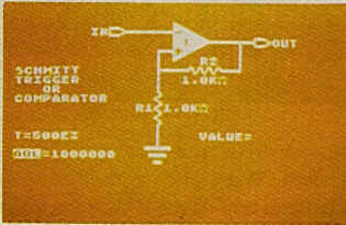 Choose a configuration from the main menu and the program displays a complete schematic of the op amp circuit. Op Amp CAD then allows you to [SELECT] the design components, input new values, and instantly see the results. Some circuit configurations can be changed by pressing [OPTION]. To return to the main menu, press [RESET].