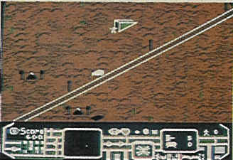 To control your saucer, you must use the joystick. Mostly, you control the altitude -- if you fly too low, you can pile into one of the features which dot the landscape: telephone poles, buildings, bunkers, etc. You can't control the speed. Instead, the saucer travels faster as you move higher.