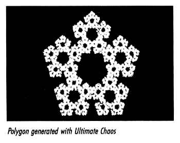 When you RUN Ultimate Chaos, you will see two Menu items on the screen. With option 1, Create Chaos, you can generate fractal patterns for polygons with up to 10 sides, using different scale factors to determine where points will be plotted. First, you will be asked to enter a name for your picture -- to be used as a filename if you choose to save your fractal image later. Enter a name with up to eight characters and press [RETURN]. The program will automatically supply .PIC as the filename extension when you are ready to save the picture to disk.