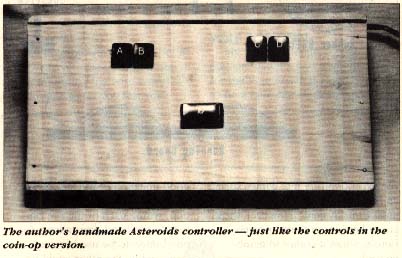 After you're sure all is well, you can build a case to match, or possibly find one that suits your needs. I built mine from wood, but you may find that a steel case from Radio Shack more suits your taste. The top surface of my case was designed to slope gently, like any normal keyboard would. This helps to relieve wrist stress during those long play sessions. Once you've played a game or two with your new controller, I'm certain you'll never use a joystick for Asteroids again.
