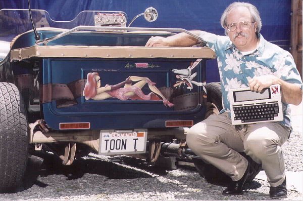 Here's a side shot of the same stuff. TOON-T is a 1923 Ford Model "T" body on an aftermarket frame. It's powered by a 1950 Ford flathead V8 and C4, 3-speed auto trans. The reason for the car and the computers together has to do with the fact that the Model 100 series computers are now called Model "T" computers. And, like the Model " T" automobile, they are still going strong after all these years.