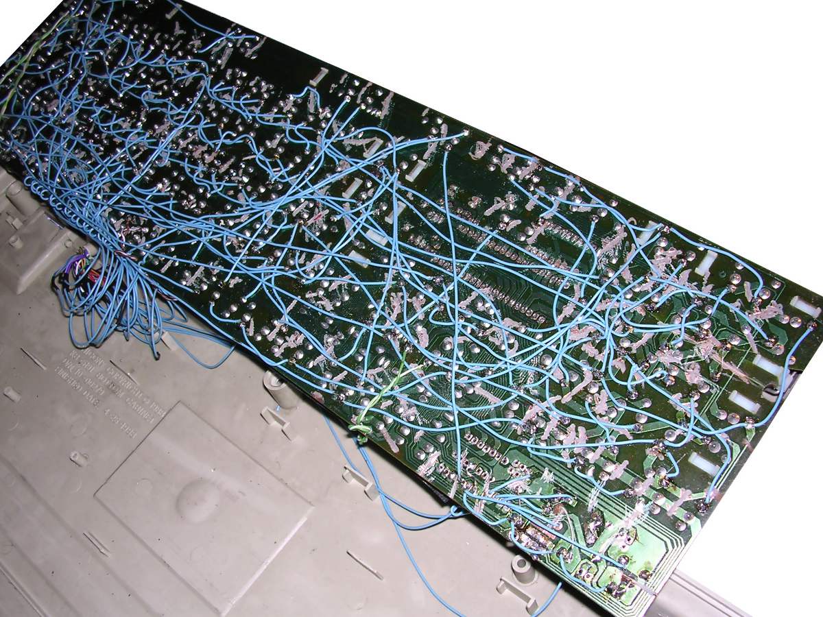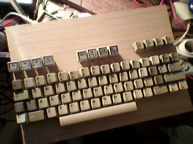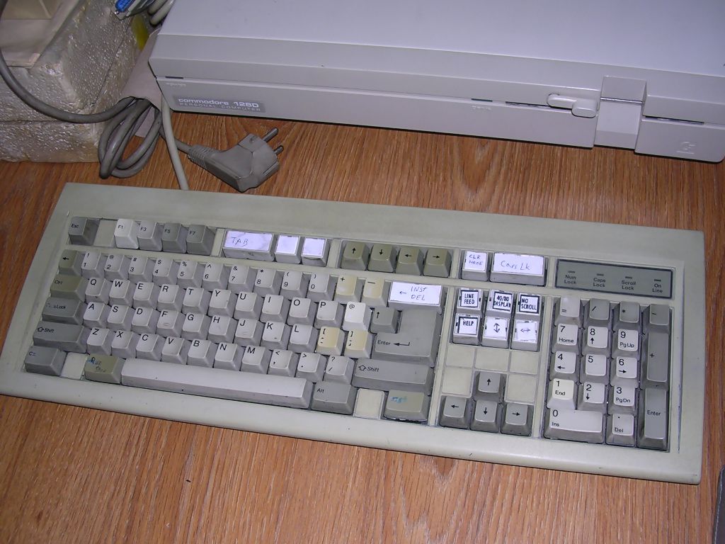 Finally after discovering that some switches are damaged, I decided to convert an old broken PC mechanical keyboard to C128 one. The keyboard had 4 damaged switches, so I replaced them with ones from my first attempt. Next, I've cut all tracks connecting keys and re-created matrix with wires. It was the most time-consuming process. I've tried to use logical switches and LEDs for 40/80, Caps and Shift Lock, but in my C128 5V supplied in pin 4 was so weak that it couldn't power all LEDs. So I've used a small bistable push buttons, as in Turbo switches in old PC cases, to switch 40/80, Caps and Shift Lock. I've installed these switches near main switches, used then to mechanically support key. It's working quite well. If you are looking for a good cable, look for printer cables. There are some parallel pinter cables with easily accessible inside of connectors. Most have pins 18-25 shorted to one wire, they won't be good, but some other cables have all 25 pins of DB25 connector conneced to 25 separate wires - these are good and can be used in keyboard.