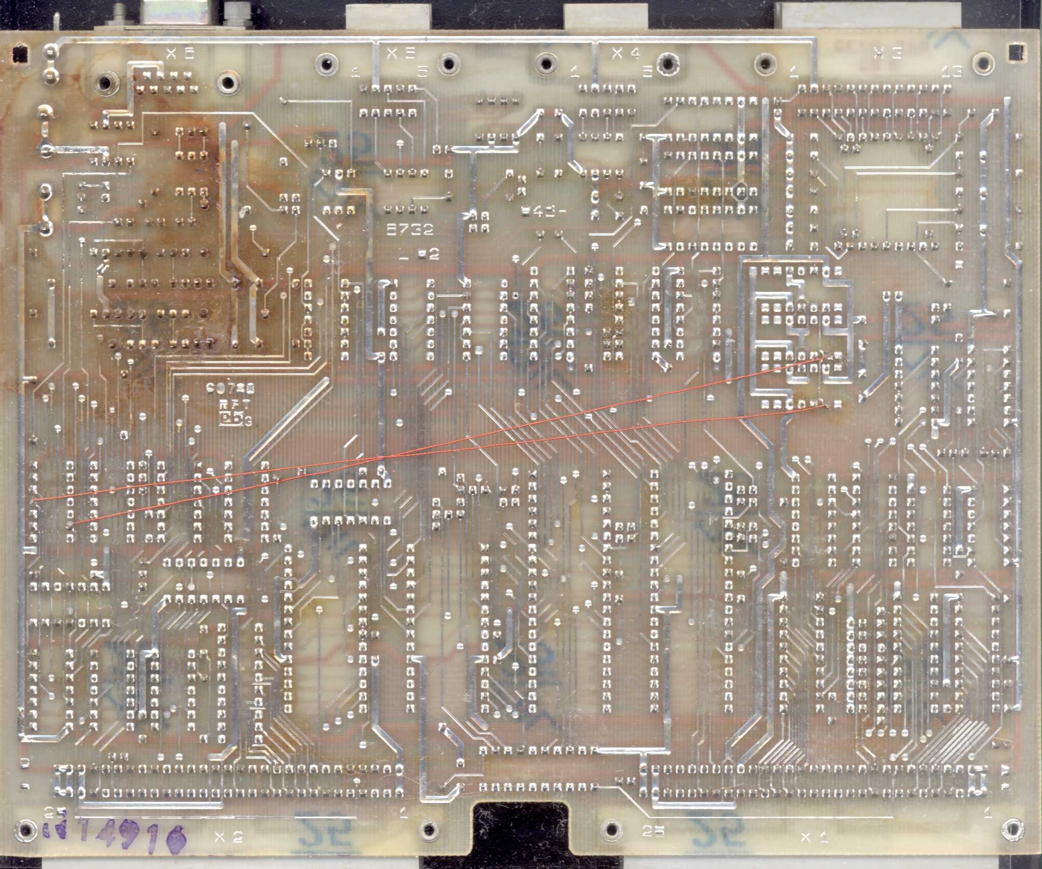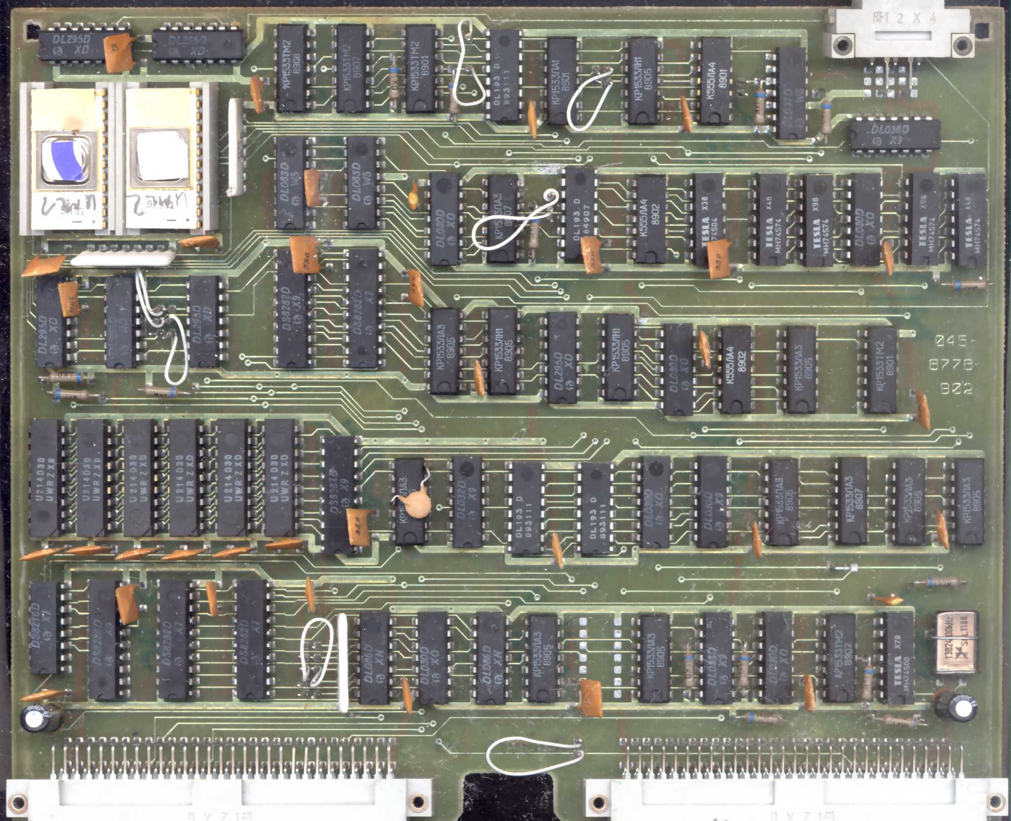 My unit is a late one with serial number 9999, manufactured in 1990. Most parts are German or western, although few Soviet chips are present. I don't have keyboard for it (the K7672, like for A7100/7150). It looks like some of 16 RAM chips require replacing as it displays "RAM F" message, in which "F" seems to be for "Fault" or "Fehler".