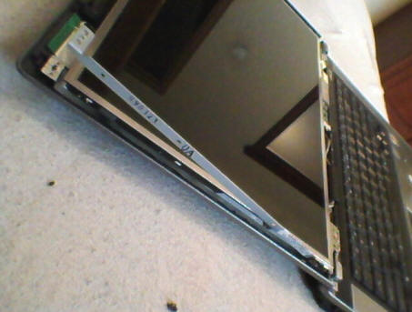 Removing locks from bottom part is similar to the upper, but you have to be careful near cables passage. It won't go smoothly, you have to slide it left, remove part and next slide it right (or reverse way). Laptop with bezel removed: