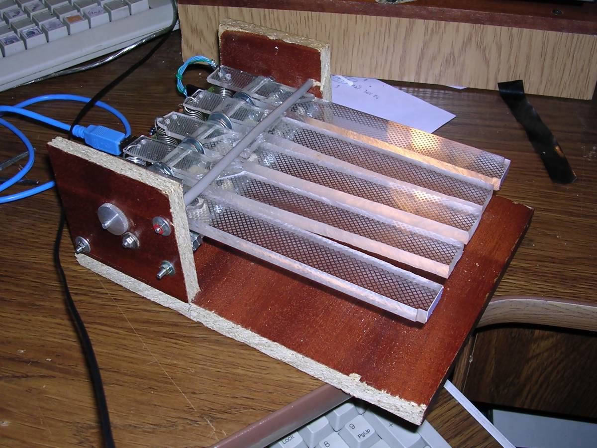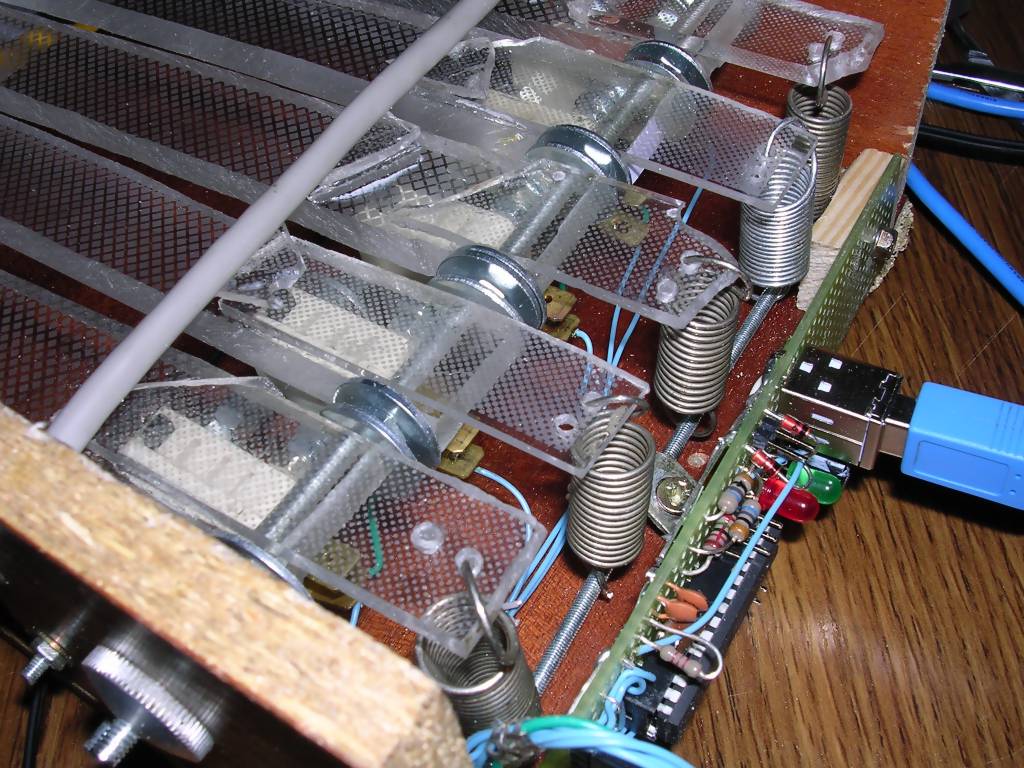| The construction is a bit different than Engelbart's, which can be seen in the Official Engelbart's NLS page: The key in original solution is pushing the button from below, the button is located above. This way the force to push a button is very small, but the key has to be very light not to push the button acting with force momentum. Engelbart used a thin pieces of flat metal, probably cut and rolled twice in one end to rotate on a shaft. There are two problems: One, if too bif gorce is uset, the metal may bent. Second, the springback is not very good. Because I had problems with cutting metal precisely (and not slashing hands during usage on sharp edges), I decided to use epoxy glass for keys and press the buttons located below the keys. Keys are quite thick (8mm) with 4mm holes for shaft. The epoxy glass is from old LCD. This glass also has quite nice engravings which prevent fingers from slipping on polished surface. |