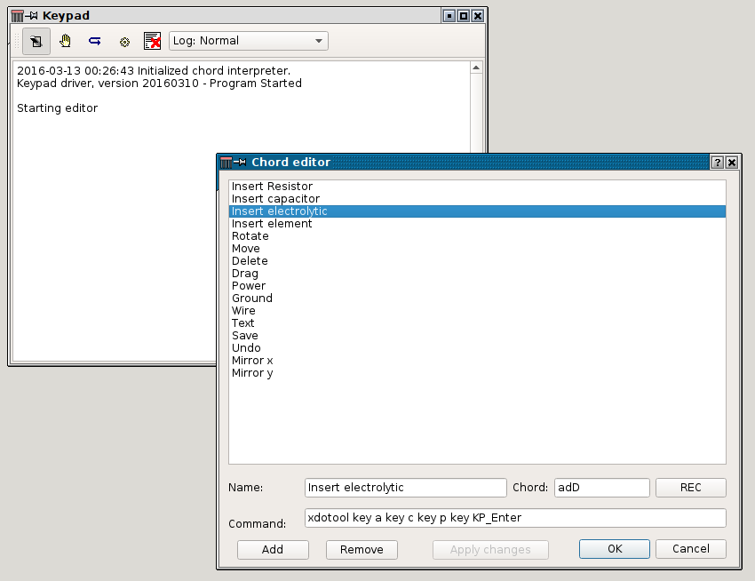 To customize keys, launch the program and close it, then edit its settings file ".chordsettings.rc" it created in home directory. There are keyboard commands for each key press/release and path to default chords file - by default ~/.chordkeypad.rc. The keycode procedure is a bit quick-and-dirty so sometimes it locks - pressing and releasing of last used keys unlocks it. Here you can download a complete source code (GPL). It requires Qt runtime version at least 5.5. It has parts of abandoned Libqxt ported to Qt 5.5, but only for Linux - Windows version is added but not ported. It compiles and runs in Debian 8 with Qt 5.5 and X windows headers (xlib or libx11-dev). |