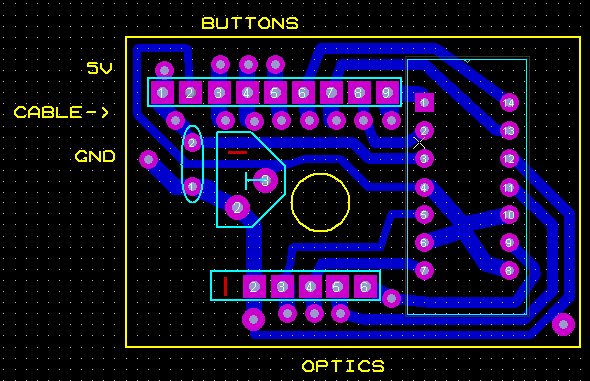 I prepared a quick-and-dirty PCB layout to quickly put this into a mouse... There is one modification, RV1 is connected to the ground, not RP1, but it's not a big difference and gives a bit smaller current consumption.