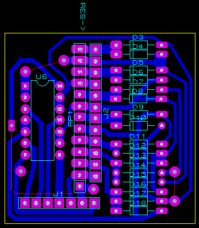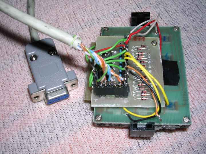 OK, Finally, here is the schematic diagram of the keypad driver. It's quite self-explanatory, the last open-collector stage is realized using 74LS09 quad AND gates IC. It MUST be 74LS09, because there's a limited load we can draw from C64's joystick port. RP1 is a 12x20KOhm resistor pack, you can use any value from 15K to 47K. Diodes are a typical signal diodes, in my case 1N4148. Keypad's key wires are connected to J2, J3 is its common ground. C64 cable goes from J1 (SIL) as shown in the table and ends with female DB-9 connector (DB9F). Its pin numbers should be OK, as they're etched on the connector's plastic part.