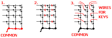 I used a typical numeric keypad from an old phone. It's a matrix keyboard, which means it's a grid of wires connected by switches. If we have a 12 keys, there will be only 7 wires coming out from the keyboard (3 columns, 4 rows). It's practical in a complex digital devices with keyboard scanning routines, but it's useless in this device. This keyboard must be a normal key set which shorts every key's wire to the common one (in our circuit: ground) - 12+1=13 wires.