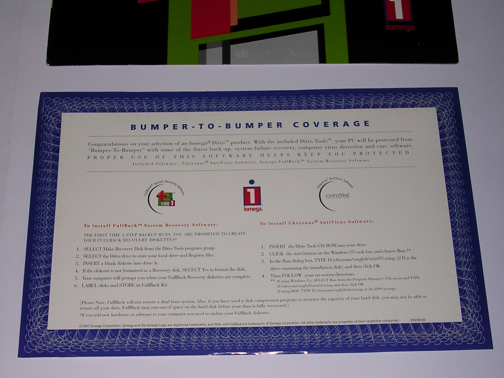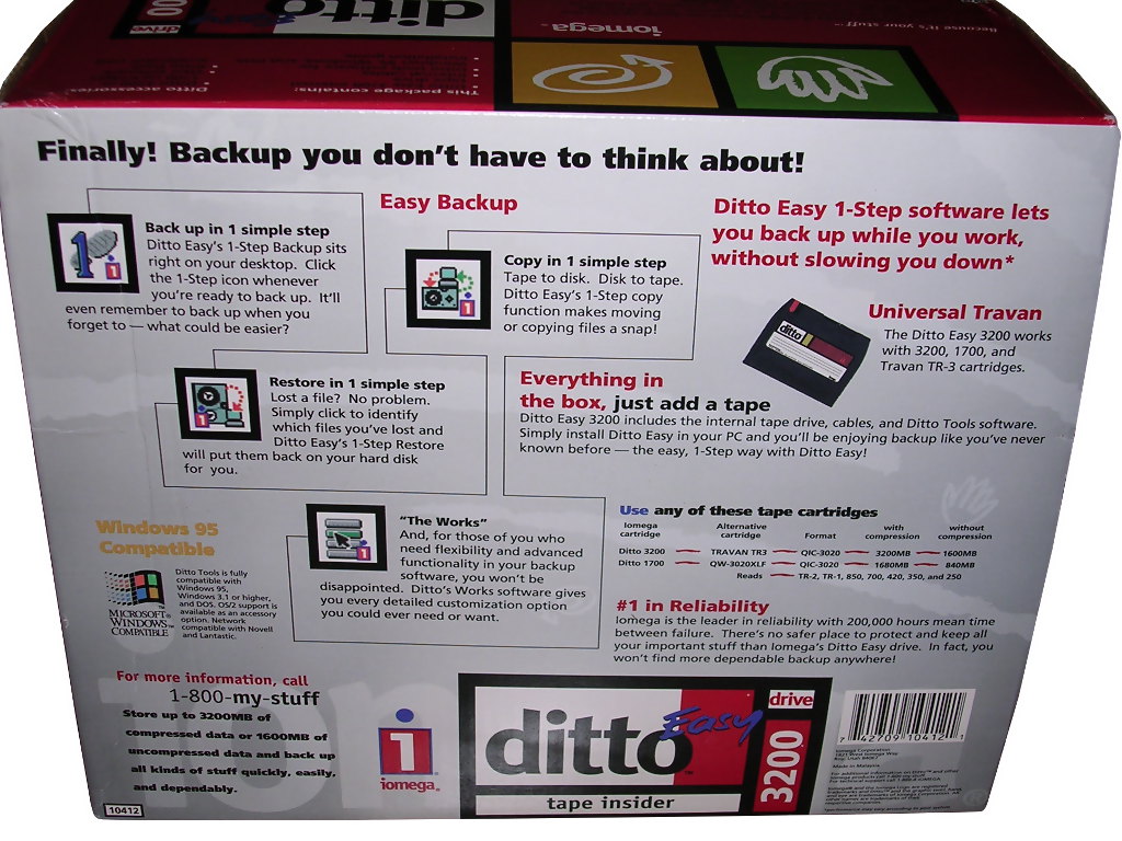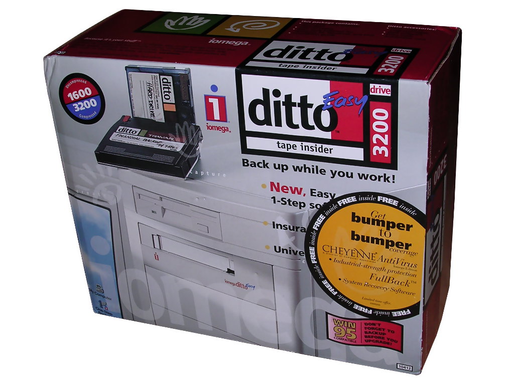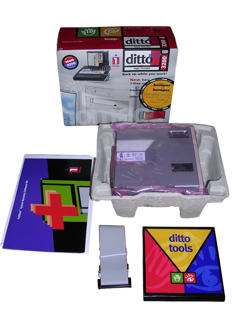 Ditto streamer was very similar to QIC-MC or Travan unit, and in fact it could read Travan tapes (could write only to Travan TR-3). It was another try to make a cheap streamer for an average home user. There was one problem: it was painfully slow. Streamers are slow, yes, but Ditto was much slower than others. 1MB/s, if you had luck: streamers like constant flow of data, and Ditto was prone to a "head polishing syndrome" in which the tape moves back and forth "polishing" the head because data transfer was too slow to write in constantly moving tape. As it was not much useful in standard consumer market (backup to one tape took too much time), it wasn't much popular. See here for compatibility chart.
